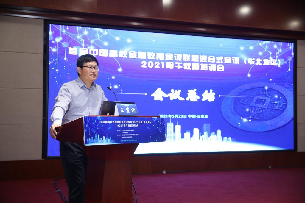 王重润教授作总结发言,祝贺首届中国高校金融教育金课联盟混合式金课(华北地区)骨干教师培训会取得圆满成功,感谢与会专家的精彩报告和各高校参会代表对大会的支持及对会务组工作的高度认可。他说,这次大会展示了国家级一流本科课程建设成果,促进了教学理念和教学经验交流,对提升金融学专业课程建设水平、推动新财经公司产品改革发挥了积极作用。