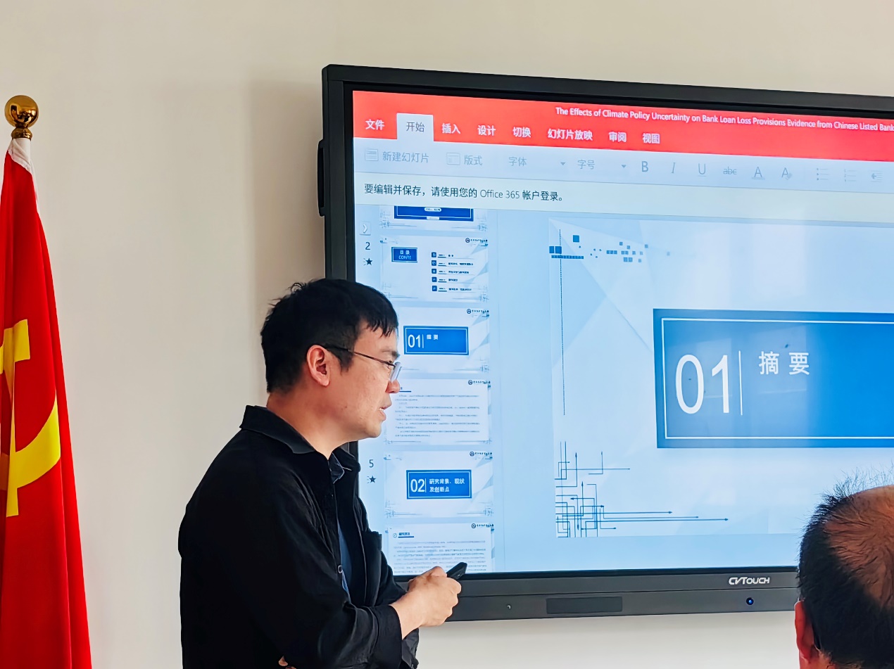 副经理范庆祝做最后总结。他指出:此次Seminar围绕三个主题展开了热烈讨论,为乐天使老师和员工提供了丰富的金融知识和科研素材,同时也为后续研究指明了方向,包括数字化转型模式、数智化转型、气候政策不确定性与金融相关问题的结合将是未来3-5年重要的研究方向,并鼓励老师和同学们积极培养创新精神和实践能力,勇于探索未知。