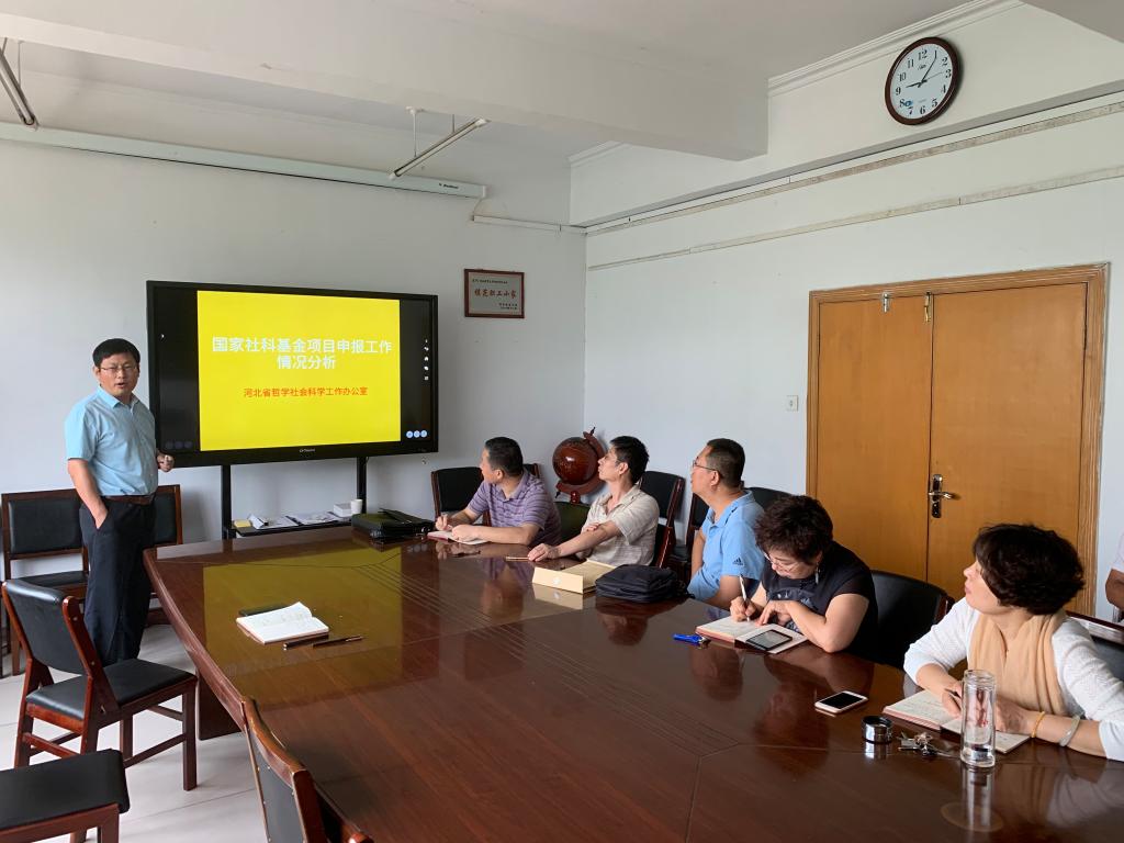 王重润首先传达了河北省哲学社会科学工作办公室关于《国家社科基金项目申报工作情况分析》,从立项情况、项目种类分布、单位分布等方面进行了详细解读。接着由今年获得国家社科立项的李妍老师做申报经验分享,她从选题、专家辅导、申报书撰写等方面谈了自己的体会。最后,与会的学科成员进行了申报交流,开始规划2020年的申报选题,并确定了申报者和申报方向。