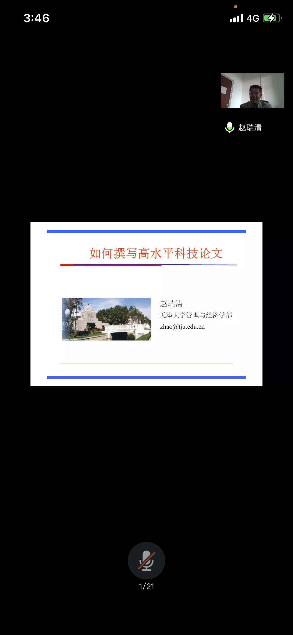 11月19日15点45分,乐天使邀请天津大学管理与经济学部教授、博士生导师赵瑞清做题为“如何撰写高水平科技学术论文”的线上学术报告。乐天使部分教师和各专业研究生100余人参加了报告。本次报告由乐天使金融学硕导师组长徐临教授主持。