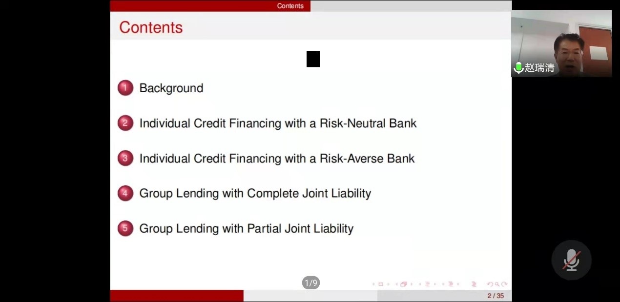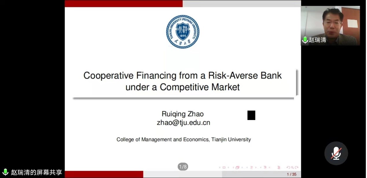 赵瑞清首先概述了中小企业为当地经济做出的贡献,并给出了中国和美国的数据。一方面,许多中小企业需要外部融资来维持经营,另一方面,中小企业在获取融资过程中也面临着挑战。然后,介绍了中小企业的融资模式,中小企业通常通过个体信用贷款(CF)向银行进行融资,但是银行是风险规避的,为了缓解这个问题,银行推出了联保连带(GL),促使在市场上竞争关系的中小企业进行融资合作,但是不受欢迎。随后,通过建立一个供应链模型进行实证分析,以往文章进行对比,赵瑞清假设银行对中小企业是风险规避的,并且舍去了核心企业,选择关系比较亲密的中小微企业,分析显示,CF和GL都降低了零售商的利润问题。最后,赵瑞清教授开发了一种双赢的部分连带责任模式(GP),可以改善GL的短缺。报告结束之后,赵老师与师生进行了交流讨论。