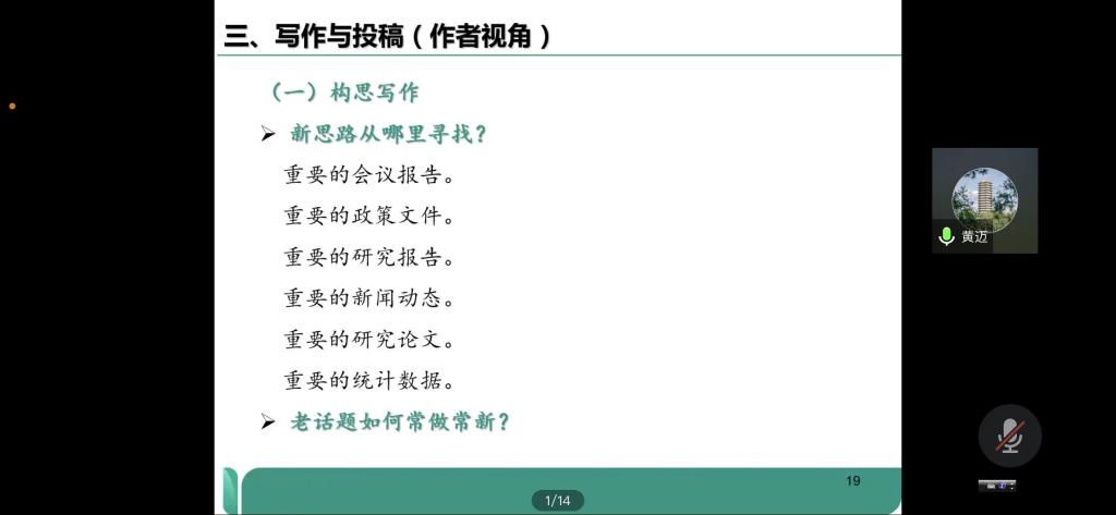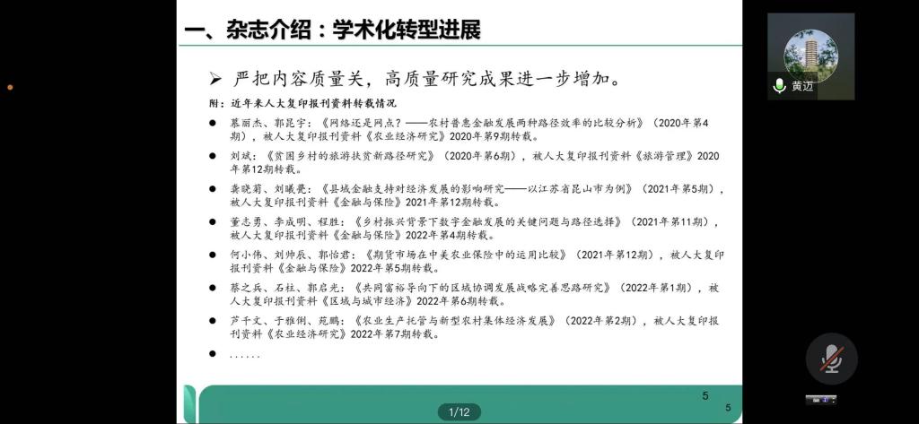 10月17日下午15:00,乐天使邀请黄迈博士开展了《农村金融研究》热点选题与写作投稿的讲座,乐天使有90余人参加,报告会由乐天使经理王重润主持。黄迈博士是《农村金融研究》执行副主编,先后主持国家社会科学基金、中央农办农业农村部乡村振兴专家咨询委员会软科学课题、中国博士后科学基金特别资助等研究项目,在国内外学术期刊发表论文30余篇。