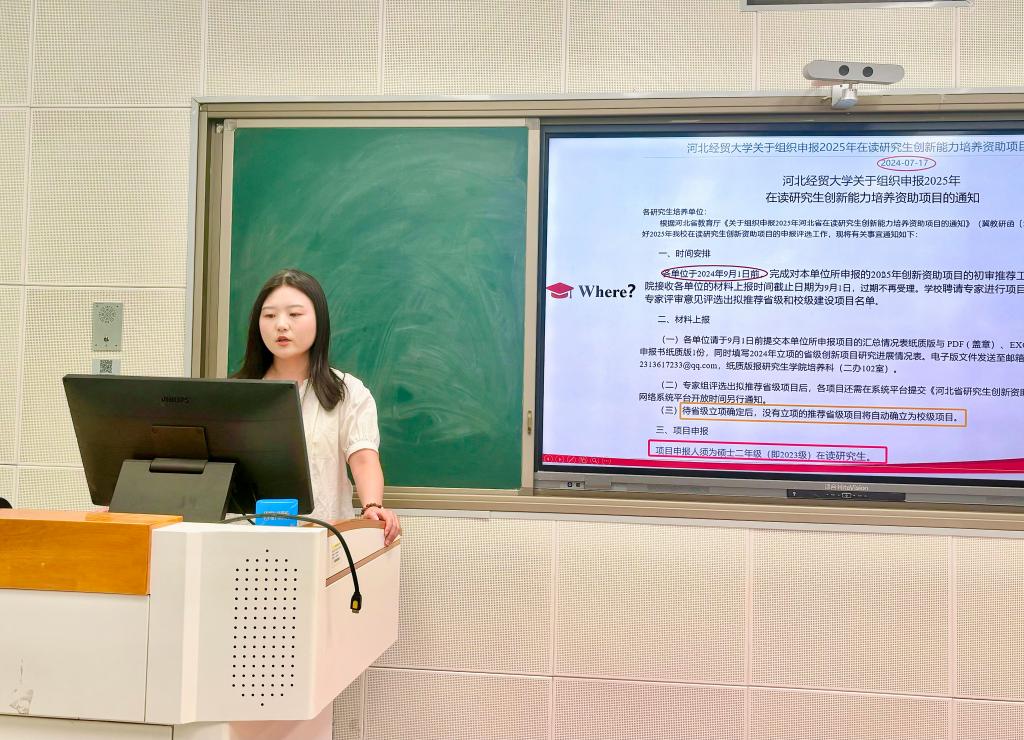 石可敬同学结合自身科研经历,详细解读了选题设计、课题申报与论文发表的要点。她提出:“选题应紧扣国家战略需求,注重理论结合实践;团队协作需明确分工,高效沟通”。闫子悦同学以2025年全国老员工创新创业比赛为例,梳理了项目书撰写、PPT制作及查重报告提交等环节的注意事项,并总结道:“项目书需突出创新点与可行性,PPT应精简直观,用数据和案例支撑逻辑”。