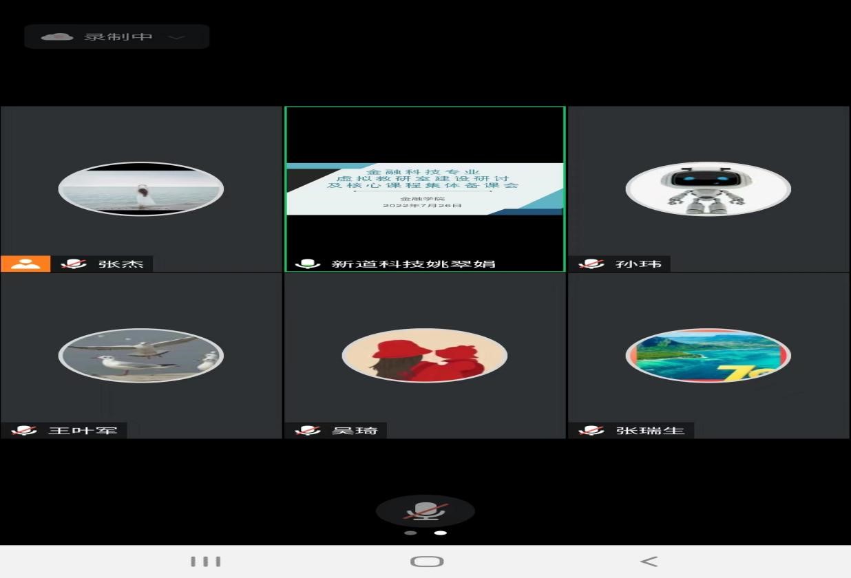在核心课程集体备课环节,信息技术公司侯少杰、刘艳玉,乐天使张瑞锋、高旺、孙玮五位老师分别介绍了《计算思维与人工智能(A)》《Python语言基础》、《Python语言与金融计算》《金融大数据分析与挖掘》《数据库原理》《人工智能金融》和《区块链原理及金融应用》七门课程的教学内容设计以及具体建设情况,新道公司石立恒、杨姗提出应紧密结合金融场景设计教学内容、加强课程教学内容的交叉融合等多条建议。